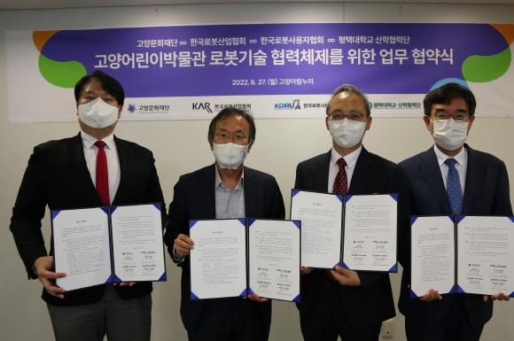 고양문화재단은 6월 27일(오늘) 고양아람누리에서 정재왈 고양문화재단 대표이사와 한국로봇산업협회 조영훈 전무, 한국로봇사용자협회 이천 센터장, 평택대학교 산학협력단 이태규 단장 등 4개 기관 관계자가 모인 가운데 업무 협약을 진행했다.