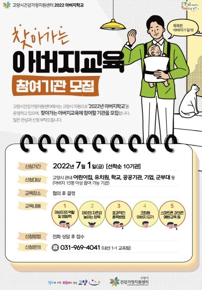 고양시 건강가정지원센터가 7월 1일(금)부터 관내 어린이집, 유치원, 학교, 기업, 군부대 등을 대상으로 찾아가는 아버지 교육 참여 기관을 모집한다.