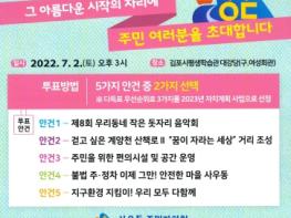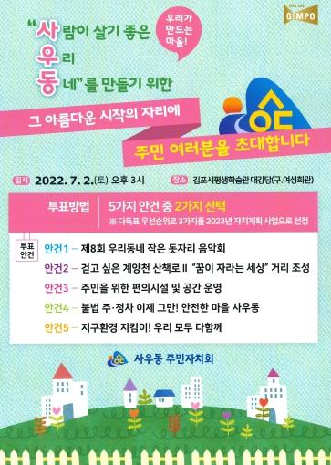 2차례에 걸쳐 진행된 주민 사전투표 결과와 7월 2일 김포시 평생학습관(구 여성회관)에서 개최되는 ‘2022년 제2회 사우동 주민총회’ 현장 투표 결과를 합쳐서 우선순위 3위까지를 2023년 자치계획 사업으로 선정할 예정이다.
