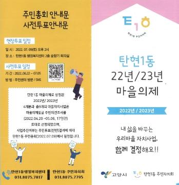 고양시 탄현1동 행정복지센터에서는 2022년 탄현1동 주민자치사업의 원활한 추진을 위한 ‘주민총회 사전투표’를 온라인 및 오프라인으로 진행한다고 밝혔다.
