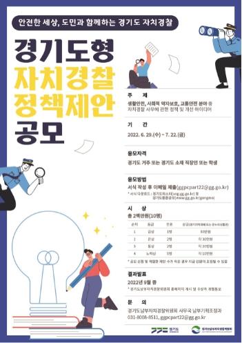 이번 공모는 자치경찰제 시행 2년 차를 맞아 경기도 치안정책에 대한 도민 의견수렴을 위한 것으로 주민 의견을 반영한 경기도형 자치경찰 정책 발굴과 주민서비스 중심의 자치경찰제 구현을 위해 마련됐다.
