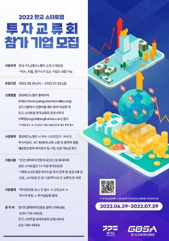 경기도와 경기도경제과학진흥원이 판교 제1?2테크노밸리 내 유망 새싹기업의 투자유치 지원을 위한 ‘판교 스타트업 투자교류회’를 개최한다. 도는 1차 참여 기업 10개 사를 다음 달 29일까지 모집한다.