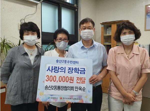 의정부시 송산2동주민센터는 6월 27일 안옥순 28통장이 저소득 가구 청소년들을 위해 장학금 30만 원을 기탁했다고 밝혔다.