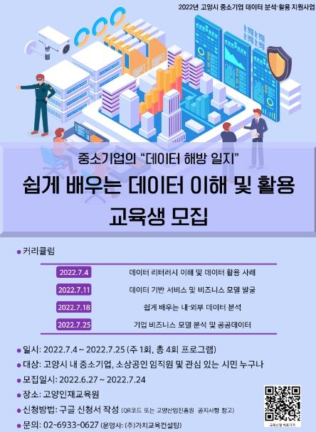 과학기술정보통신부(한국지능정보사회진흥원)가 주관하는‘2022년 고양시 중소기업 데이터 분석·활용 지원 사업’의 하나로 진행되는 이번 교육은 7월 4일(월)부터 매주 주 1회, 총 4회에 걸쳐 기본 교육과 심화 교육으로 진행된다.