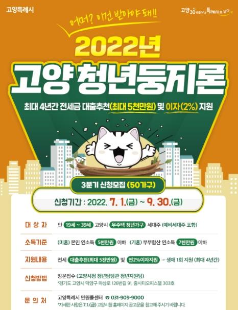 고양시가 7월 1일부터 ‘고양 청년둥지론’ 사업의 3분기 지원가구(50가구)에 대한 신청자 모집을 진행한다.