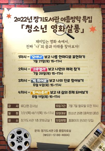 김포시 장기도서관은 2022년 7월 21일부터 8월 11일까지 매주 목요일 오후 15시부터 17시까지 장기도서관 1층 문화교실 1에서 김포시 청소년(중학생)을 대상으로 '청소년 영화살롱' 강연을 운영한다.