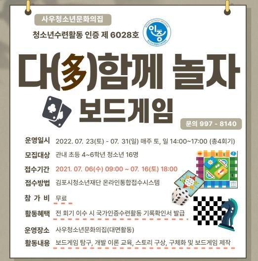 보드게임과 관련된 다양한 활동을 해보고 직접 나만의 보드게임을 만들어 보는 활동을 해봄으로써 창의성과 협동심을 기르는 인증 제6028호 ‘다(多)함께 놀자’ 프로그램은 관내 초등학생 4 ~ 6학년 청소년 16명을 선착순으로 모집하며, 7월 6일 수요일 오전 9시부터 김포시청소년재단 홈페이지 온라인통합접수시스템에서 신청 가능하다.