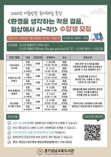 경기성남교육도서관(관장 전성룡)이 5일부터 2022년 여름방학 독서체험 특강 ‘환경을 생각하는 작은 걸음, 일상에서 시~작’ 참가 신청서를 받는다.