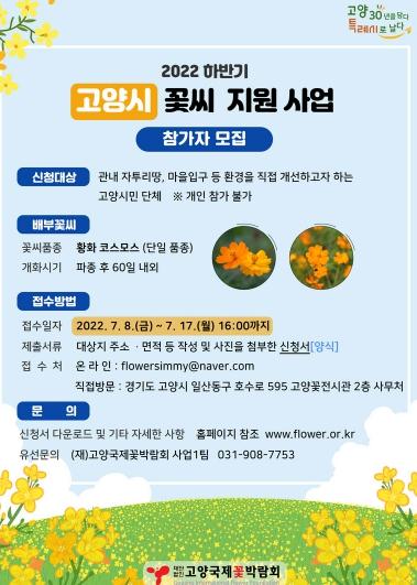 재단법인 고양국제꽃박람회는 시민이 직접 꽃밭을 조성해 생활 환경을 개선하는 '2022 하반기 고양시민 꽃씨 지원 사업'의 참가자를 7월 8일부터 7월 17일까지 10일간 모집한다고 밝혔다.