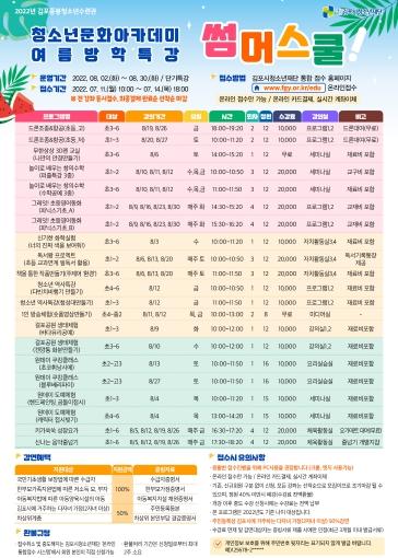 (재)김포시청소년재단 김포중봉청소년수련관은 관내 청소년들의 창의성 증진 및 다양한 문화체험 지원을 위한 여름방학특강 단기특강 “썸머스쿨” 수강생을 2022년 7월 11일(월) 10시부터 7월 14일(목) 18시까지 선착순 모집한다.