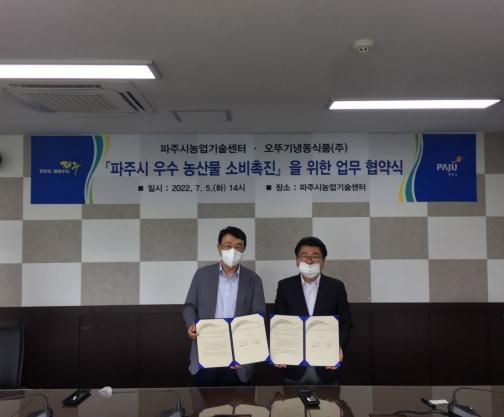 파주시농업기술센터는 지난 5일 오뚜기냉동식품(주)과 판로에 어려움을 겪는 관내 우수 농산물의 소비촉진을 위한 업무협약을 체결했다고 밝혔다.