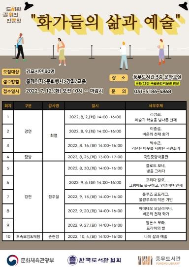 김포시 풍무도서관은 길 위의 인문학 '화가들의 삶과 예술'을 8월 2일부터 10월 4일까지 매주 화요일에 10회에 걸쳐 3층 문화교실에서 운영한다.