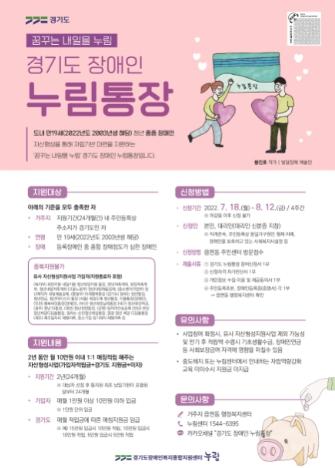 허성철 경기도 장애인복지과장은 “도내 중증 장애인에게 조금이나마 보탬이 되고자 누림통장을 추진하게 됐다”며 “참여하는 장애인들의 자립 출발점이 되기를 기대한다. 향후에도 도내 장애인에게 ‘기회가 넘치는 경기도’를 만들 수 있도록 노력하겠다”고 말했다.