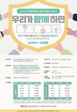 경기도여성가족재단 경기도디지털성범죄피해자원스톱지원센터가 디지털 성범죄를 예방하고 건전한 디지털 문화를 확산할 콘텐츠 발굴을 위해 8월 8일까지 ‘2022년 디지털 성범죄 예방 콘텐츠 공모전, 우리가 함께하면’을 개최한다.