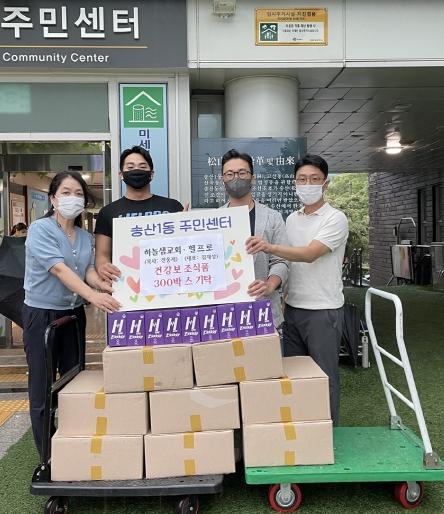 의정부시 용현동 소재의 하늘샘교회와 헬프로는 7월 13일 송산1동주민센터를 방문해 여름철 기력 보충을 위한 건강보조식품 300상자(1,500만 원 상당)를 기부했다.