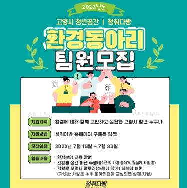 고양특례시 청년공간 청취다방이 ‘청년 환경동아리’에 참여할 동아리 회원을 7월 30일까지 공개 모집한다.