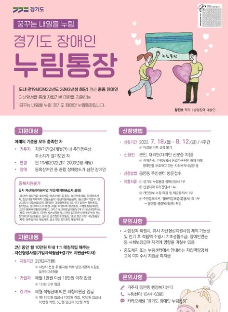 부천시는 관내 만19세(2003년생) 중증 장애인을 대상으로 ‘경기도 장애인 누림통장 사업’을 오는 8월 12일까지 접수한다.