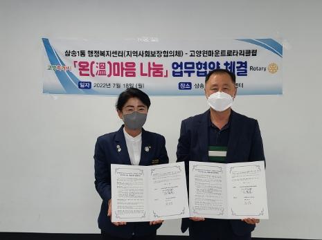 고양특례시 삼송1동행정복지센터 지난 18일, 고양원마운트 로타리클럽과 관내 저소득 및 취약가구의 복지증진과 주거환경 개선 등 맞춤형복지 지원을 위해 '온(溫)마음 나눔' 업무협약을 체결했다고 밝혔다.