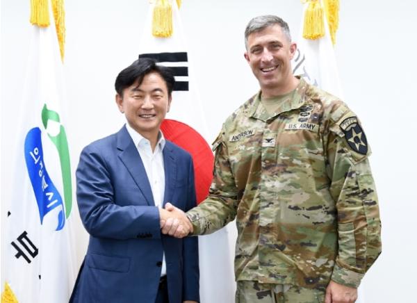 김동근 의정부시장은 7월 19일 의정부시청에서 브랜든 앤더슨(Anderson C. Brandon) 미2사단 부사단장과 첫 만남을 가졌다. 이번 달 취임한 브랜든 앤더슨 부사단장과 반가움의 인사를 나누며, 지역 현안에 대한 의견과 향후 교류 방안을 논의했다.
