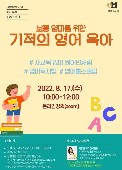 부천시 역곡도서관은 여름방학을 맞이하여 자녀 영어 교육을 주제로 2022. 8. 17.(수) 오전 10시에 이성원 작가와 함께하는 온라인(zoom) 특강을 개최한다.