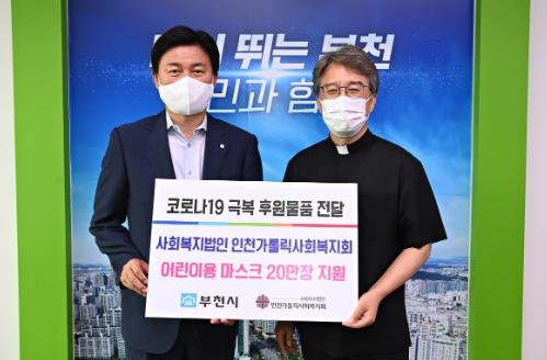 부천시는 지난 19일 사회복지법인 인천가톨릭사회복지회에서 최근 증가하고 있는 신규 확진자를 대비하여 감염 취약계층인 어린이를 위해 2,000만 원 상당의 어린이용 마스크 20만 장을 기탁했다고 밝혔다.