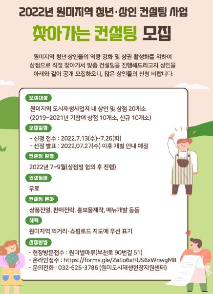 부천시는 원미도시재생지역 상권 활성화와 효과적인 사업 운영을 돕기 위해 원미도시재생사업지 내 상가를 대상으로 ‘찾아가는 컨설팅’에 참여할 상인을 7월 13일부터 7월 26일까지 모집한다.