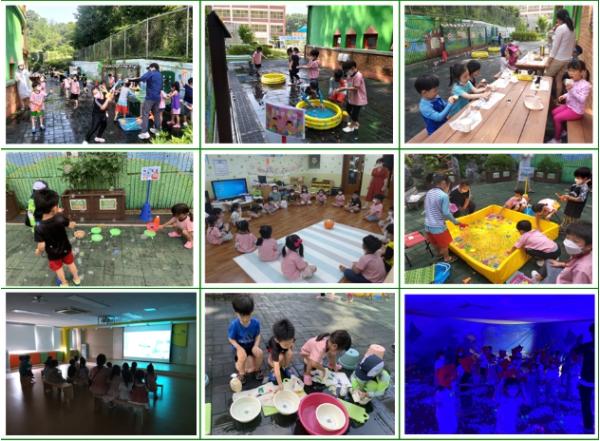 유치원 바깥놀이터에서 낚시놀이, 수정토 촉감놀이, 비눗방울 놀이, 유아들이 직접 염색한 손수건 빨래하기, 물풍선 터뜨리기, 물총 놀이를 하고, 휴식영역에서는 따뜻한 보리차와 유치원에서 수확한 감자를 간식으로 먹으면서 행복한 물놀이 시간을 보냈다.