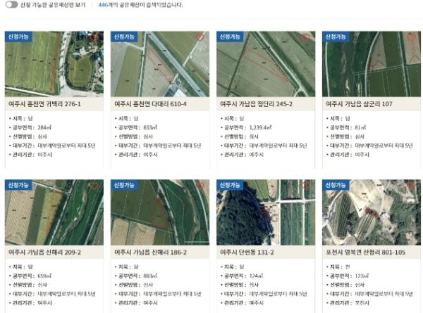 경기도가 현재 행정 목적으로 사용하고 있지 않은 도유재산 가운데 일반 도민에게 빌려줄 수 있는 땅을 공유시설 예약 플랫폼인 경기공유서비스에 공개하고, 온라인으로 대부신청을 받는다고 25일 밝혔다.