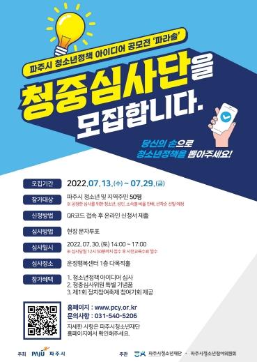 파주시는 오는 29일까지 공정한 청소년정책 제안 심사를 위한 파주시 청소년정책 아이디어 공모전 본선 청중심사단 50명을 모집한다고 밝혔다.