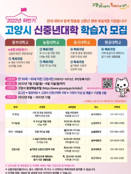 고양특례시가 오는 7월 25일(월)부터 8월 15일(월)까지 5060 신중년대학 하반기 학습자 200명을 모집한다.