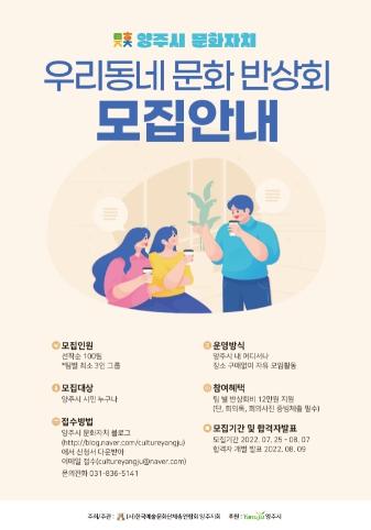 ‘우리동네 문화반상회’는 2022년 양주시 문화자치 활성화사업의 첫 프로젝트로 시민 의견 수렴을 위한 공개 시민회의이며, 시민이 주체적으로 동네 문화에 대해 이야기하고 의견을 공유하며 회의주제, 시간과 장소, 모임 대상 등을 꾸려 자율적으로 진행된다.