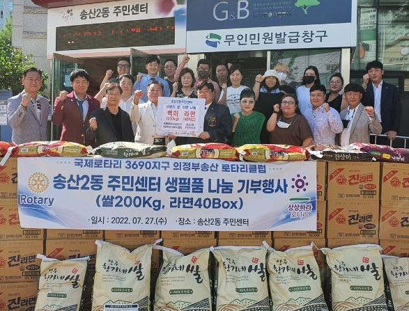 의정부시 송산2동주민센터(동장 이종일)는 7월 27일 국제로타리 3690지구 의정부송산로타리클럽(회장 권오준)이 쌀(200kg)과 라면(40상자)을 기부했다고 밝혔다.