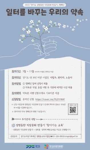 경기도여성가족재단이 11월 30일까지 성평등한 직장문화 조성을 위한 캠페인 ‘일터를 바꾸는 약속’을 진행한다.