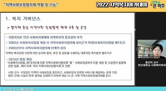 홍선미 교수는 ‘지역사회보장협의체의 역할 및 기능’이라는 주제로, 지역사회 문제를 해결할 때 커뮤니티케어(지역사회 통합돌봄)의 중요성을 전하며, 지역사회의 나눔문화 구축과 민관협력을 기반으로 사회문제를 혁신적으로 해결해야 한다고 강조했다.