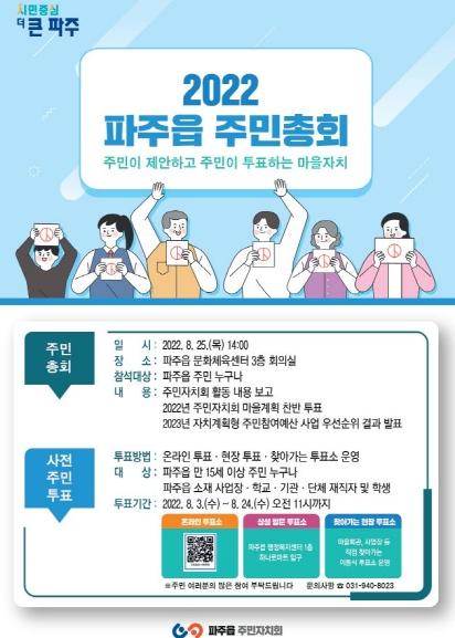주민총회는 파주읍 주민 누구나 참여 가능하며, 올 하반기 마을계획에 대한 찬반 투표와 함께 2023년 자치계획형 주민참여예산 사업 우선순위를 결정하게 된다.
