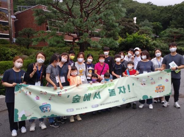 2022년 8월 11일 양주시 장애인종합복지관(김정희 관장) 기능향상지원팀에서는 발달장애 아동, 청소년, 성인 이용인 9가정, 22여명이 참석한 가운데 새마을운동중앙회에서 주최하는 ‘숲에서 놀자-숲 체험 캠프’를 진행하였다.