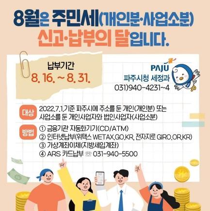 파주시는 7월 1일 파주시에 주소를 둔 세대주의 경우 주민세 개인분을, 사업소를 둔 사업주의 경우 주민세 사업소분을 오는 31일까지 신고·납부해야 한다고 밝혔다.