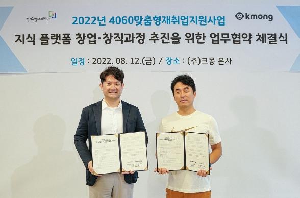 양 기관은 12일 서울 서초동 소재 ㈜크몽 본사에서 ‘지식플랫폼 창업?창직과정 추진을 위한 협약(MOU)’을 체결했다. 협약에 따라 도내 4060세대 미취업 중장년을 대상으로 ‘프리랜서 마켓 창업·창직과정’을 올해 시범적으로 추진한다.