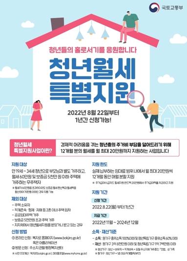 청년 월세 한시 특별지원사업은 코로나19 장기화로 인한 경제 상황 악화가 청년들의 고용 여건에 부정적으로 작용하여 경제적 어려움을 겪고 있는 청년층의 주거비 부담 경감을 위해 12개월분의 월세를 매월 최대 20만원까지 지원(주거급여 수급자의 경우 주거급여액 중 월차임분을 차감한 금액)하는 사업이다.
