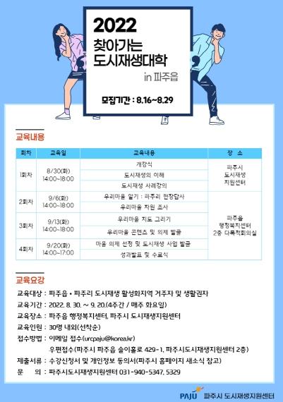 교육은 8월 30일부터 9월 20일까지 매주 화요일에 실시되며, 1회차에는 파주시 도시재생지원센터에서 2회차부터 파주읍 행정복지센터 2층 다목적회의실에서 진행된다.