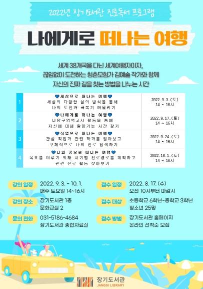 김포시 장기도서관은 2022년 9월 3일부터 10월 1일까지 매주 토요일 오후 14시부터 16시, 장기도서관 1층 문화교실2에서 김포시 청소년을 대상으로 '나에게로 떠나는 여행' 강연을 운영한다.