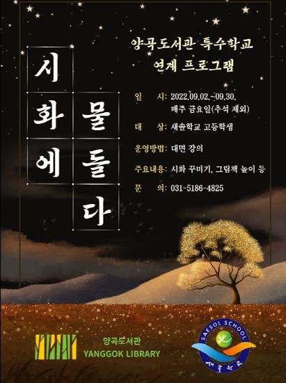 김포시 양곡도서관은 9월 독서의 달을 맞이하여 정보취약계층 독서문화 프로그램 '시화에 물들다'를 9월 2일부터 9월 30일까지 추석을 제외한 매주 금요일 오전 10시부터 2시간 동안 김포시 새솔학교에서 운영한다.