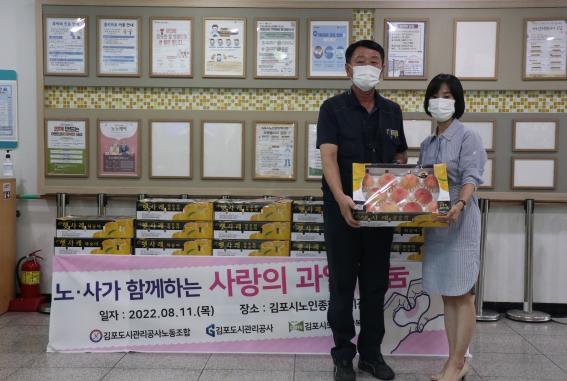 김포도시관리공사 김포도시관리공사 노동조합은 지난 11일 이웃과의 나눔을 실천하기 위하여 김포시노인종합복지관에 복숭아 40박스를 기부했다.