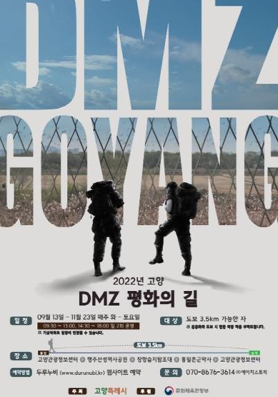 고양특례시가 비무장지대(DMZ) 인근의 생태?역사?평화 자원을 생생하게 체험할 수 있는 ‘디엠지(DMZ) 평화의 길’을 운영한다. 디엠지평화의길 고양 구간은 9월 13일부터 11월 23일까지 주5일, 1회당 선착순 20명으로 제한하여 개방된다.