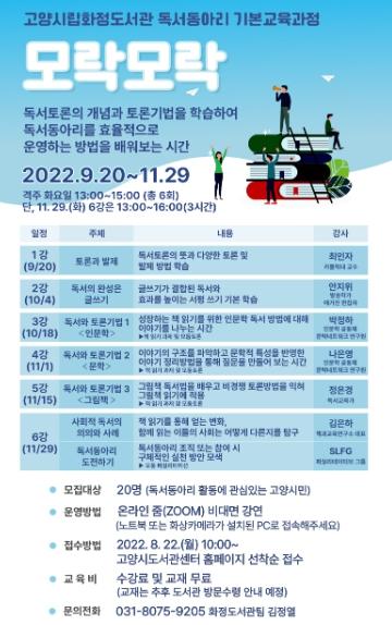 고양특례시 화정도서관이 2022년 경기도 독서동아리 활동지원사업의 운영 기관으로 선정되어 ‘모락모락’ 독서동아리 기본교육 강의를 진행한다.