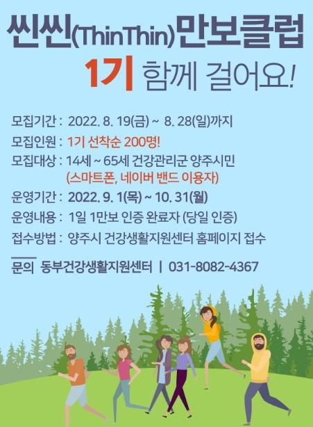 양주시 건강생활지원센터는 오는 28일까지 ‘씬씬(Thin Thin) 만보클럽’1기 참가자 200명을 선착순으로 모집한다.