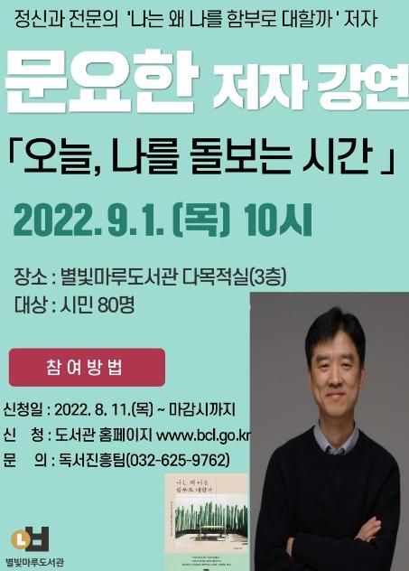 부천시 별빛마루도서관은 독서의 달을 맞이하여 '자기 치유, 자기 돌봄'이라는 주제로 9월 1일 오전 10시에 문요한 저자 특강을 개최한다.