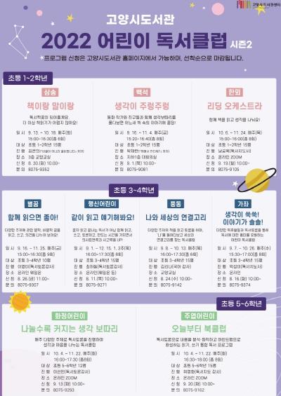 고양특례시 도서관에서 오는 9월부터 2022 어린이 독서클럽 시즌2을 운영한다. 올 4월부터 진행된 시즌1에 이어 9개 시립도서관에서 학년별로 다양한 주제의 독서클럽이 진행될 예정이다.