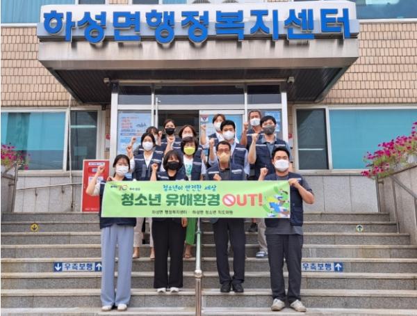 하성면행정복지센터(면장 권이철)는 지난 18일 여름휴가철을 맞아 면 직원과 청소년지도위원 10여 명이 참여한 가운데 청소년 유해환경 합동개선활동 캠페인을 실시했다.