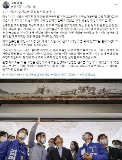 김 지사는 이 글에서 “정부가 1기 신도시 정주 환경 개선을, 연구용역을 거쳐 2024년에나 마스터플랜을 수립하겠다고 밝혔다”면서 “2기 및 3기 신도시에 비해 상당히 후순위로 미룬 것으로 사실상의 공약 파기”라고 지적했다.